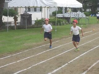 続いて3校時は3・4年生が体育でした。やはり3・4年生も徒競走で記録とりをしていました。蒸し暑い中、適宜休憩や水分をとりながらラジオ体操などにも取り組んでいました。