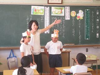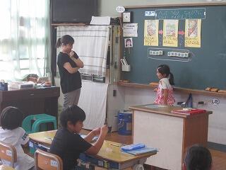 『みんな好きな外国語活動です。果物や野菜を英語で言うと?簡単、簡単。え!先生はえいごの歌が歌えるんですか?はい、河島英五の歌。』
