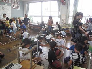 『図工、つなぐんぐんで柱状に丸めた新聞紙を使ってみんなで何やら作っていました。楽しそうな4年生でした。』
