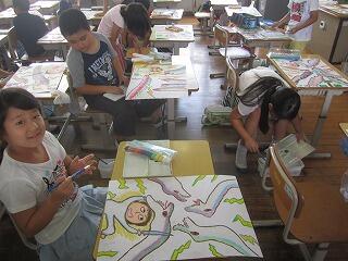 『2年生の教室をのぞいてみると、読書感想画の彩色に取り組んでいました。みんな中々の力作でしたよ。』