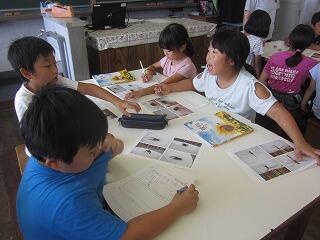 『3年生理科。自分たちが捕まえた昆虫の写真をもとに、その体のつくりについてグループで話し合っています。』
