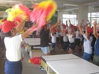 運動会まで2週間を切った本日昼休み、赤・白共に応援の全体練習を行いました。エール交換の練習はこれまで全校体育でも行ってきましたが、途中行う応援合戦の練習は今日が初めてでした。赤・白共に気合いを入れて大声を出しながら練習していました。