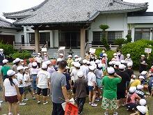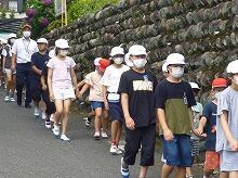 まず、運動場に避難した後、「津波警報」が発令された想定で、学校から「祐国寺」に移動です。