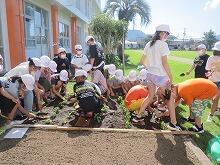 6年生のみんなは、青いサルビア、赤いサルビア、ジニア(ヒャクニチソウ)、ニチニチソウ、マリーゴールドの5種類を丁寧に植え付けました。技術員の甲斐先生が学級園の土を耕し、作業がしやすいようにと敷板を準備してくださったおかげで、短時間で終わらせることができました。