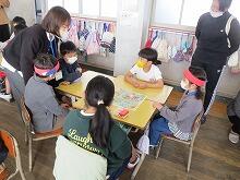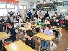 算数の授業の様子を参観したり、すごろくやまとあてゲームを1年生と一緒に楽しんだりしました。授業体験の後には、担任の飯村先生が準備した学校の1日の生活をまとめた動画を視聴しました。この動画で、来年度入学してくるお友達は、さらに入学してくる楽しみがふくらんだと思います。最後に、「入学してくるのを楽しみにしているよ。」などのメッセージが入った手作りメダルのプレゼントを1年生が渡しました。