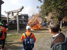 神社のお堂の中で、神事が行われ厳かな雰囲気になったところで、さあ!もうそろそろ点火かな?とか思っていましたら、違うんです。なんと、火起こしから始まるのです。あの有名な「まいぎり式」の火起こしです。時間はかかりましたが、それでも1時間もかからず火は起きました。とっても風が強い日でしたので、せっかく火がついても消えてしまわないか心配しましたが、大切な火が消えないように囲いがしてありました。伝統的な行事ですから、その辺りはきちんと考えられています。