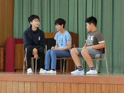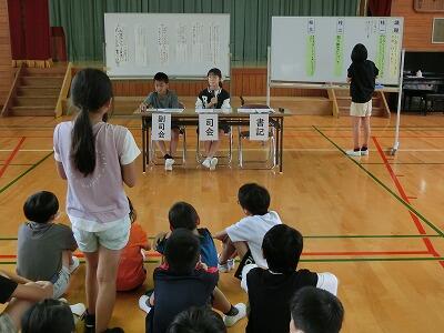 4~6年生が体育館に集まって、「川島小学校をもっとよくすればどうしたらよいか」「楽しい学校にするにはどんなことをするか」について話し合いました。