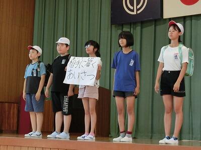 月目標の話の後は、陸上の大会にて4×100mリレーで見事優勝した6年生児童の表彰を行いました。日頃の練習の成果が発揮できましたね。これからもさらに記録がのびるようがんばって下さいね。おめでとう!