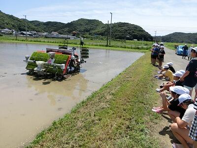 自動運転で動く田植機が苗を植えていく様子も見せていただきました。だれも乗っていなくても、田んぼの中で上手に回転する様子や、たくさんの苗をあっという間に植えることが出来るスピードにみんなはびっくりしていました。