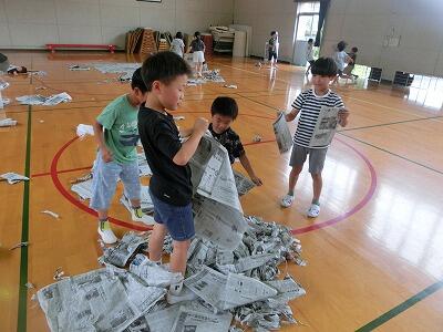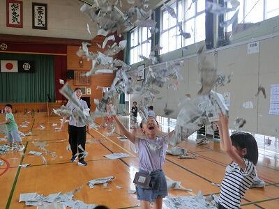 6月25日(木) 写真は2年生の図工「しんぶんしとなかよし」の様子です。体育館いっぱいに広がって、新聞紙を小さくちぎって、飛ばしてみたり、体に何枚も重ねて隠れてみたりと、自由に思いっきり活動しました。中には、かわいいドレスを作って、素敵なファッションモデルになっているお友達もいました。子どもたちの発想の豊かさにはびっくりしますね。