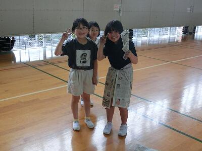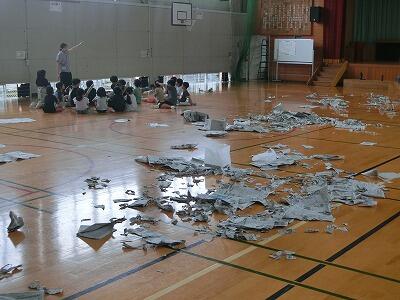 みんな汗びっしょりになるまで活動し、暑くなったらスポットクーラーで涼み、また活動するというように、時間を忘れて夢中になっていました。気付くと体育館の床はすごいことになっていました・・・ この後、片付けもみんなで協力してがんばった2年生です。