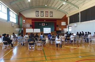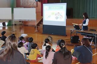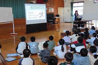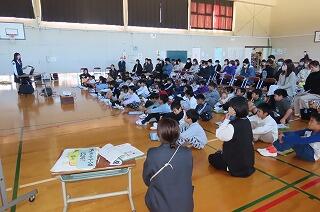 今回は3学年合同で体育館で行いました。宮崎県警察本部 生活安全部少年課 延岡地区サポートセンターから少年補導員職員の方々が3名来校され、子どもたちと保護者へ向けてお話をしてくださいました。