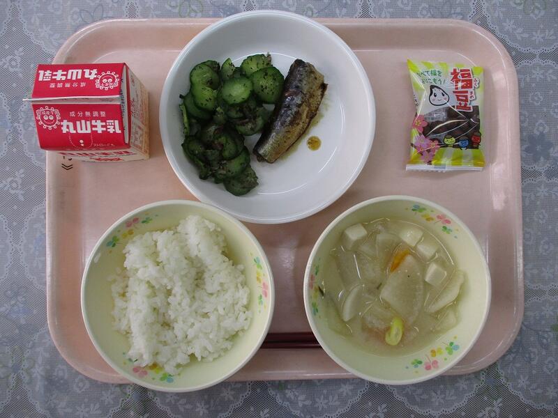 2月3日、節分です。今日の給食は、節分メニュー「いわしの甘露煮・きゅうりのゆかりあえ・呉汁・ごはん・牛乳・節分豆」でした。邪気払いと福を呼び込む食事を楽しみました。