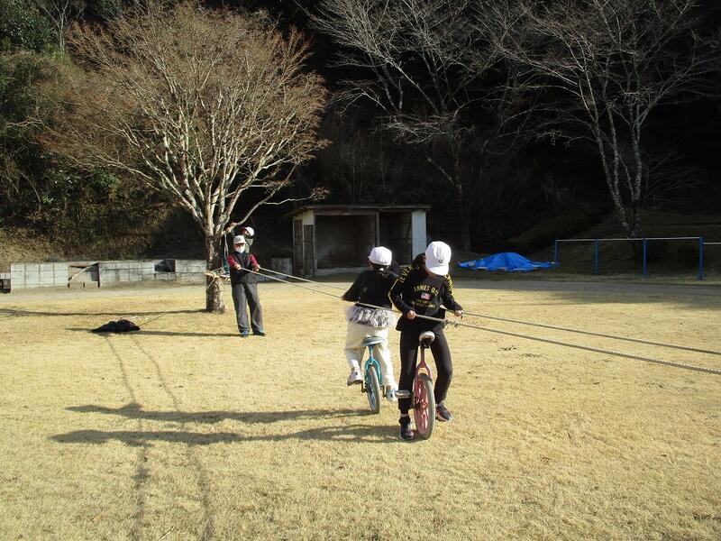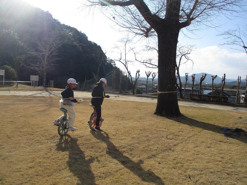 2月2日の放課後、子どもたちが一輪車で遊んでいました。地域の安全管理員さんが木と木の間にロープを張ってくださって、子どもたちは、そのロープを支えにしながら練習をしていました。一輪車に乗るのはなかなか難しいですが、地域の方からあたたかく見守られながら、一輪車練習を楽しんでいました。地域のみなさん、ありがとうございます。