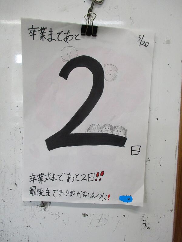 いよいよ今週は、25日が卒業式、26日が修了式です。年度末になり、各教室も片付けが始まっています。また、校舎のあちらこちらにメッセージが記されています。