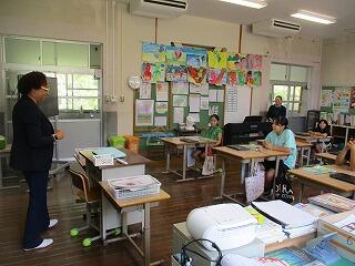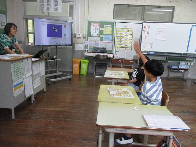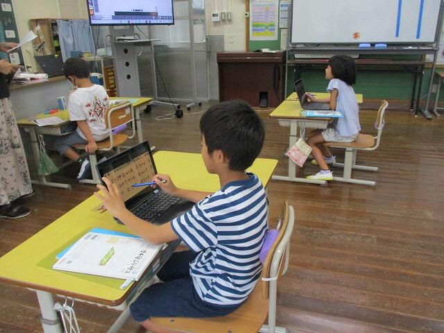 1年生は「大きな数」、2年生は「見方・考え方をふかめよう」の学習でした。3年生は「分数」、4年生は「小数のかけ算とわり算」の学習でした。複式学習ですので、先生がずっとついているわけではありません。自分の考えをしっかりもって発表したり、自分で図をかいて式を立てたりと、子どもたちは、一生懸命考えていました。タブレットも効果的に活用することができていました。先生は、子どもたちに寄り添いながら、時に、子どもたちと対話しながら、学習を進めていました。