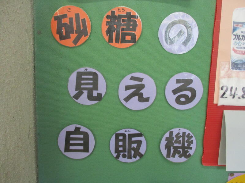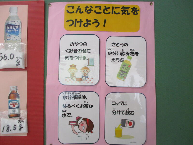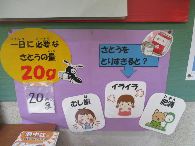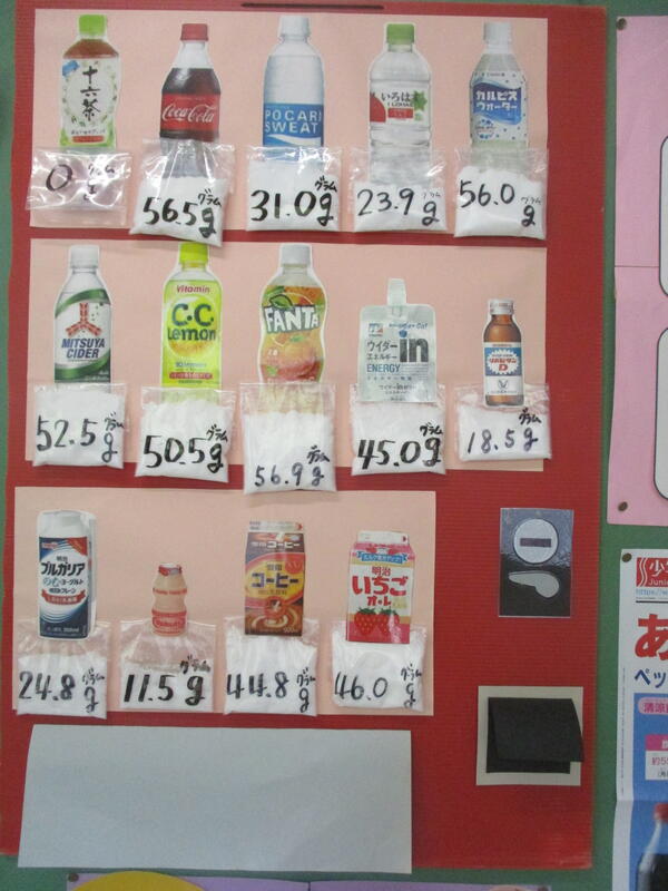 今月の保健室前の掲示板です。『砂糖の見える自販機』という言葉、自販機に並べてあるジュースやスポーツドリンクなどの飲み物に入っている砂糖の量に、子どもも大人もドキッとしています。1日に必要な砂糖の量は、20グラムですので、ジュースに入っている砂糖の量を見ると、ビックリしてしまいます。暑くて喉が渇き、冷たいジュースがおいしい季節ですが、砂糖の量に気をつけて、味わいたいですね。