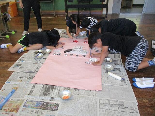 9月13日、合同図工の時間に、運動会の際に飾るそれぞれの団の絵を描きました。子どもたちが、自ら進んで描きたいとのことで、今年度の運動会でも団看板に取り組むことになりました。先週から、どんな絵を描くかを決めて下描きを進めてきました。今日は、それぞれの団に分かれて、全員で協力し合って色塗りをしました。運動会本番に向けて、気持ちも盛り上がってきたことでしょう!