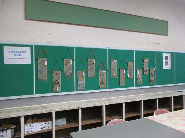 先日、放課後子ども教室で、造形活動がありました。地域の安全管理員さんに、材料を準備していただき、作り方を教えてもらって、おしゃれな「シーグラスを使ったかべかざり」ができました。麻の布に、いろいろな色のシーグラスを、好きな形や模様に貼り付けて仕上げていました。シーグラスは、地域の安全管理員さんが、港地区の海で見つけて集めた物です。多目的室に、展示しています。ぜひ、学校にお越しの際に、ご覧下さいね!