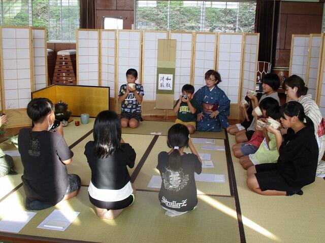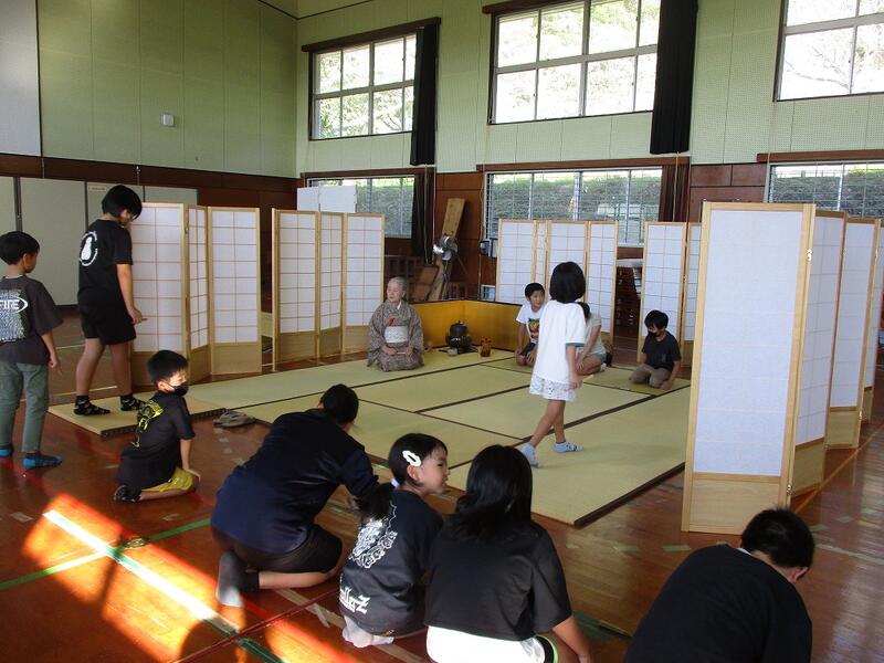 昨日、10月9日、放課後子ども教室で、茶道の先生を招いて茶道教室がありました。体育館に畳や掛け軸、生け花などを準備して、本格的にお作法を学び、お茶をいただいていました。子どもたちは、学校とはまたひと味違う一面を見せていました。正座をして、お茶碗を両手で持ち、丁寧にお茶をいただく姿は、とてもステキでした。正座が大変だったり、抹茶がちょっと苦手だったりする子どもたちも、最後までがんばって礼儀正しく活動しており、感心しました。