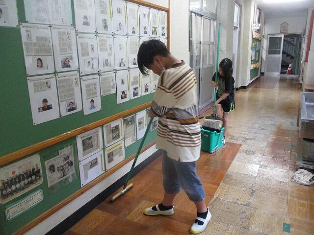 9月5日、そうじの時間の様子です。2学期から、そうじの当番や方法などが少し変わりました。少ない人数で、校舎、トイレ、体育館などのそうじをがんばっている子どもたちが、より効率的にそうじができるように工夫したところです。ぞうきんモップを活用して教室の拭き掃除をしました。また、トイレ掃除では、友達と話し合って役割分担をしながらがんばっています。