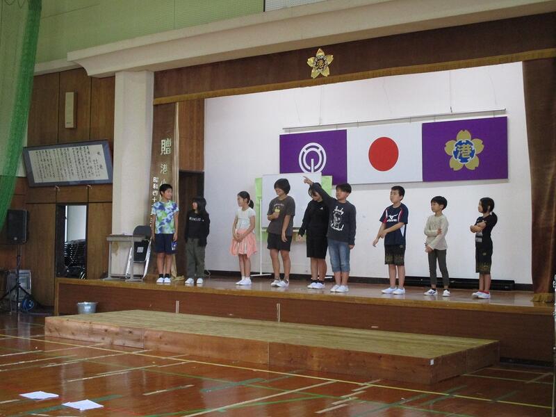 10月2日、5年生と6年生の外国語Lesson4のまとめとして、一人ずつ外国語で発表してみんなに伝える活動をしました。この発表をゴールに、これまで学習をがんばってきました。今日は、3・4年生のお友達、先生たちに聞いてもらいました。