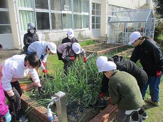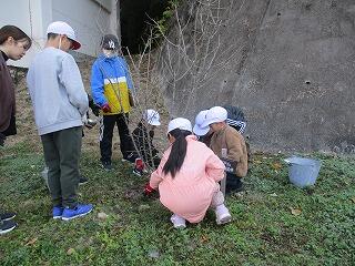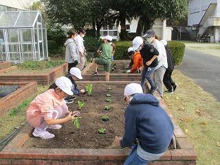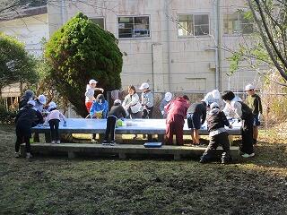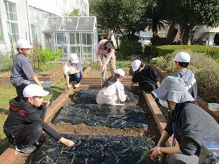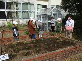 9月に「よのなか教室」として農業講話をしていただいた三雲さんからいただいたたまねぎの苗を3、4年生が植えている様子です。