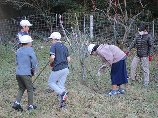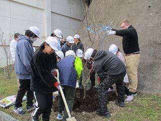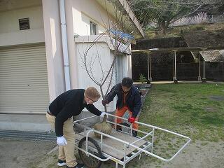 大きな梅の苗木をALTの先生に運んでいただき、事前に掘ってあった穴に入れてもらいました。