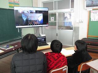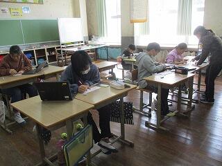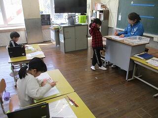 1~5年生は体育館で、6年生は教室でそれぞれ卒業式の歌の練習をしています。
