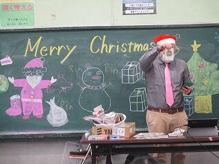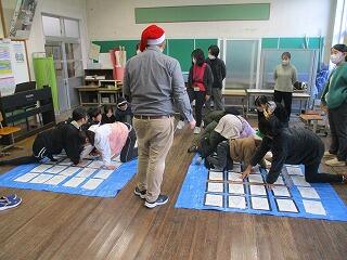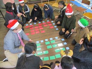 全校児童がALTの先生と、クリスマスを題材とした様々なゲームに取り組んでいる様子です。
