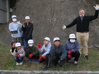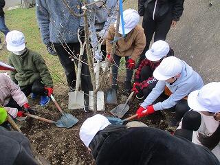 児童が穴を埋め水やりをして、ALTの先生にテープカットしていただきました。