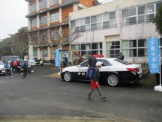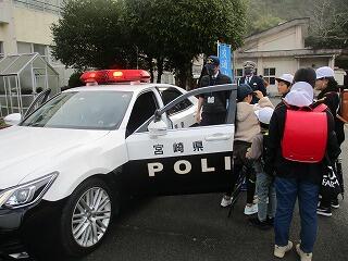 延岡市交通少年団の取組で、登校時に児童がパトカーの中から交通安全の呼びかけをしました。