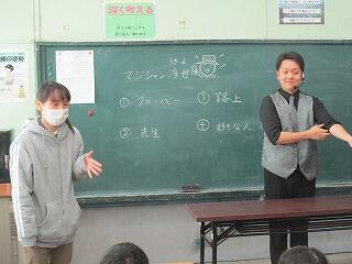 マジシャン浮世さんを講師にお招きして、「夢を叶えるために」というテーマでキャリア教育の講話をしていただきました。