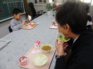 校長室で給食を食べることなどありませんので緊張の面持ちですが、思い出を語りながら楽しく食事をしていました。