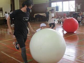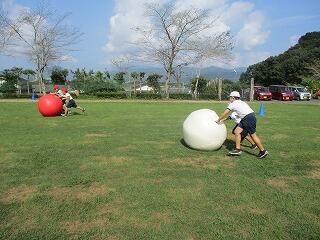 下学年が「大玉転がし」を行うときは、上学年がお父さんお母さんの代わりになって転がすのを手伝ってくれました。