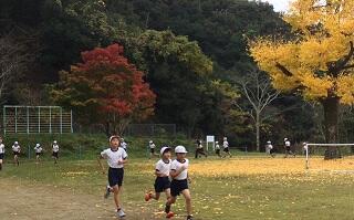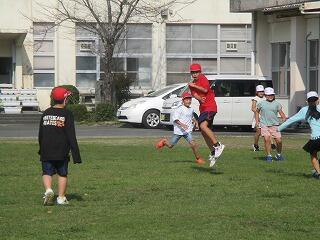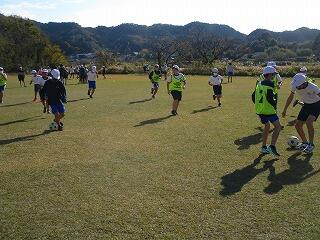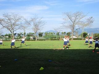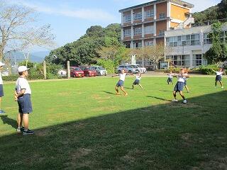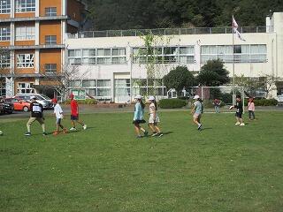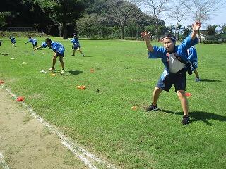 サッカー・野球・タグラグビー・陸上の各競技に分かれ、各会場で指導を受けます。港小は、午前中サッカーの指導を受けました。一ヶ岡小学校の人達とミニゲーム等を楽しみました。