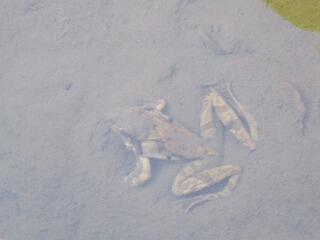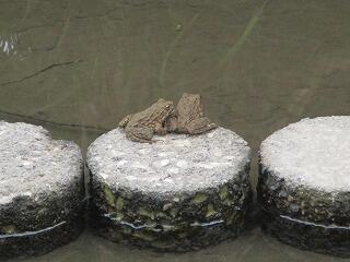 先日、校舎裏のビオトープの池にカエルが2匹いました。以前、水草のホテイアオイに乗っていたカエルかと思われます。朝見かけて1日中動かず、ずっと同じ場所で寄り添っていました。