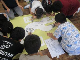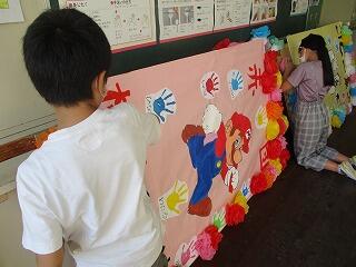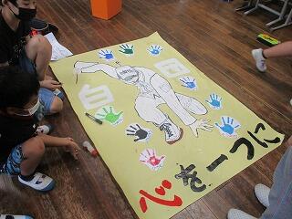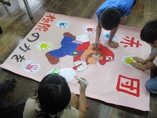 赤団・白団ごとに分かれて、色を塗りました。最後には団員の手形をはって完成です。協力して仲良く仕上げました。