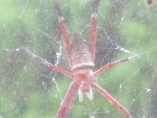 ここしばらく校舎の外に巣を張っているクモが気になっていました。いろんなところで見かけるコガネグモやジョロウグモは見かけず、代わりに写真のクモを何匹か見かけます。腹部の模様が、白い歯と2つの目玉にも見え「私は宇宙人だ」とでも言っているようです。(いずれも港小で)