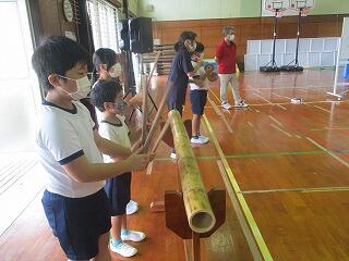 昨日は、わんぱく太鼓の練習が行われました。今年は上級生の人数が減ったため、1・2年生も参加しての練習となりました。リズムをとりながら、竹やチャッパを叩く練習を行いました。