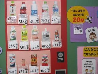 保健室の掲示板に「砂糖の見える自動販売機」が掲示されています。1日に必要な砂糖の量20グラムに対して、自動販売機でよく販売されている飲料水1本にどれくらいの砂糖が含まれているかが、実際の砂糖を使って一目で分かるようになっています。炭酸飲料1本で軽く必要量の倍を超えているので、飲み過ぎには気をつけなくてはと思います。