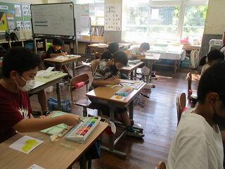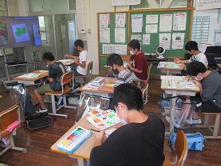 今日は、3年~6年生合同で水彩絵の具の使い方を学習しました。水彩絵の具の特徴を学び、水のきり方、混色の仕方等に気をつけながら、ミカンや葉っぱの絵に彩色をしました。
