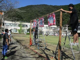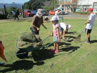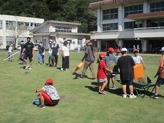 子供達もお家の方も一緒になって、運動場の草を集めたり、入退場門の設営をしたりしました。予定より早く終了することができました。
