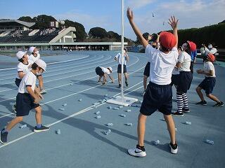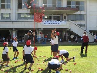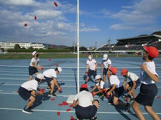 生涯スポーツの部では、港小学校はスポーツ玉入れに参加しました。名水小との連合チームで南小と競い合いました。チームワークよく取り組み、3分間で81個入れることができました。なんと午前の部午後の部を合わせた中で総合3位ということで喜び合いました。