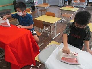 今日は、学年ごとに運動会で使った道具の片付けを行いました。団旗にアイロンをかけたり、用具を運んだり、花飾りを取り外したりしました。