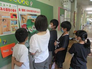 保健室の田中先生が、この間の砂糖が見える自動販売機の掲示を取り外し、目の愛護デーにちなんだ「だれの目?」と言う掲示物にはり替えています。穴からのぞく目が何の動物の目か、開くと答えが分かるようになっています。早速集まってきた人達が答えを言い合っているところでした。
