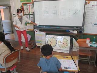 今日は、1・2年算数科の研究授業を担任の阪本先生が行いました。1年生は「たし算(2)」2年生は「図をつかって考えよう」という学習です。複式指導のため、先生が2つの学年を行き来して指導します。ブロックを使って操作活動をしたり、司会者を決めて自分達で学習を進めたり、タブレットのヒントを通して考えをボードに書いたりする姿が見られました。
