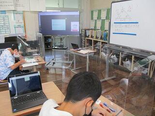 先生が一方の学年を直接指導している間に、もう一方の学年は司会者を決めて進めるガイド学習を取り入れたり、タブレットを使って個別に考えをまとめたり、ペアで解決の見通しを話し合ったりしました。