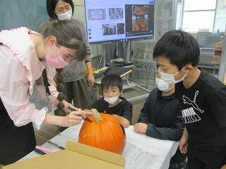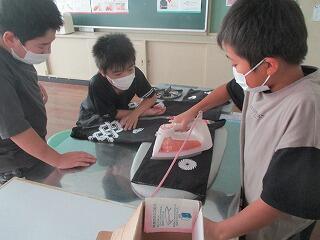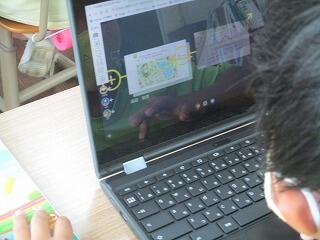 2年生は、ピーマンやオクラをスタンプにしてデザインを描きました。色や形を楽しんでいました。3年生は、算数でタブレットを使いました。コンパスで描いた円をタブレットで写真に撮ってロイロノートに読み込んでいました。