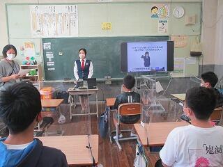 マスコットの「アリンコちゃん」は、みんなコマーシャルで知っていたようです。「契約をする」ということの意味や、「オンラインゲームの課金」等、小・中学生に多いトラブルについて具体的に教えていただきました。みんな、自分にもありえる話として真剣に聞き入っていました。
